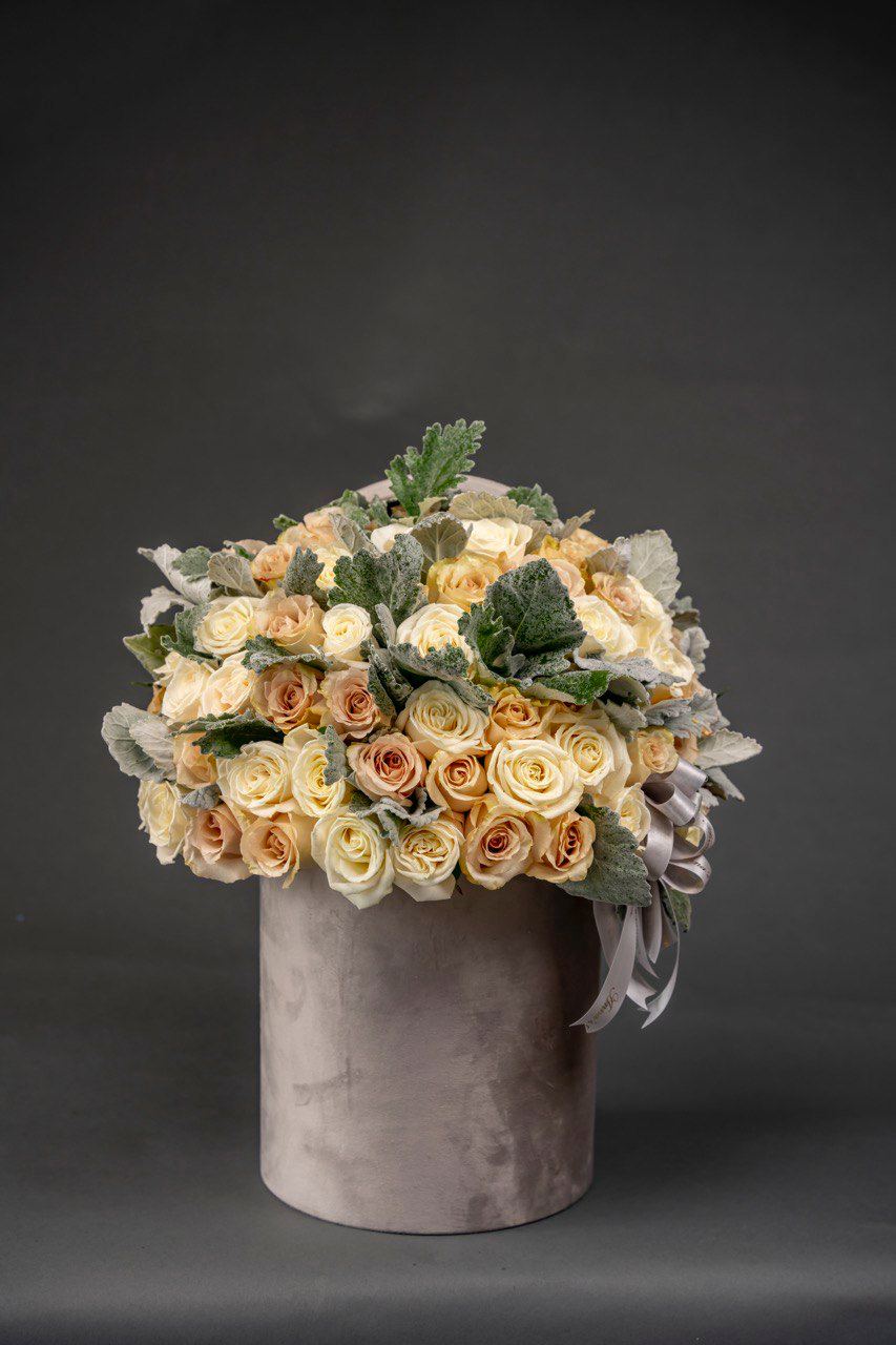Nude and white roses with dusty miller in gray velvet box